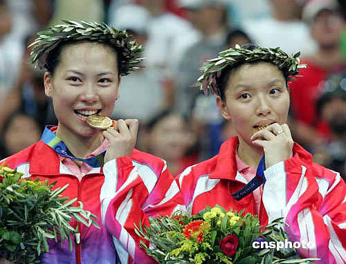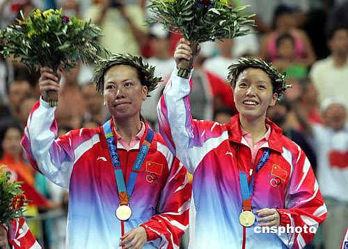 中新社雅典八月二十一日電 廣東球員張潔雯/楊維今天在奧運會羽毛球女雙決賽中,戰勝世界冠軍黃穗/高崚,奪得金牌。