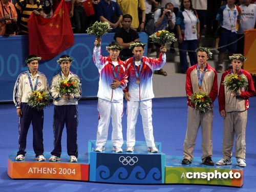 雅典當地時間8月21日下午,中國乒乓球選手馬琳、陳玘在男雙決賽中以4比2戰勝香港選手李靜、高禮澤,獲得本屆奧運會男子雙打冠軍。中新社記者:任晨鳴