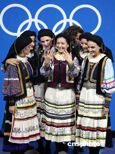 當地時間八月二十二日下午,雅典奧運會射擊比賽全部結束,身著民族服裝的頒獎女郎在五環前留影。中新社記者:毛建軍