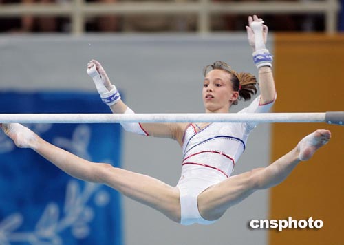 中新社雅典八月二十二日電 在雅典當地時間晚上十點十分左右結束的奧運會體操女子高低杠決賽中,俄羅斯名將霍爾金娜在自己的優勢項目中出現失誤,法國選手利潘尼斯奪取金牌。中國運動員名列第五和第七位。