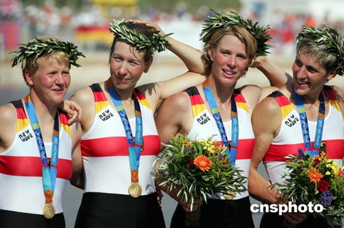 當(dāng)?shù)貢r間八月二十二日,德國隊在雅典奧運(yùn)女子四人雙槳賽艇比賽中獲得冠軍。中新社記者:毛建軍