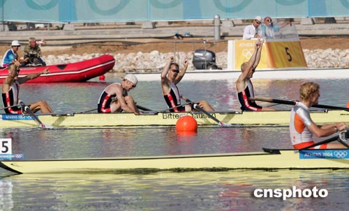 當地時間八月二十二日,丹麥選手獲得雅典奧運男子四人單槳賽艇比賽冠軍。中新社記者:毛建軍