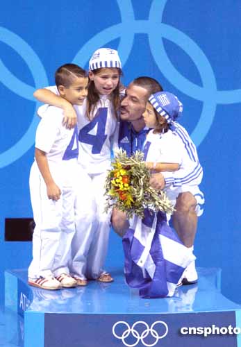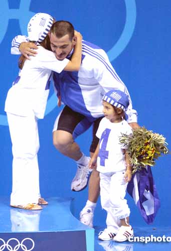 圖為當地時間21日進行的男子85公斤級舉重比賽中,銅牌得主希臘選手迪馬斯與他的孩子們一起分享勝利的喜悅。