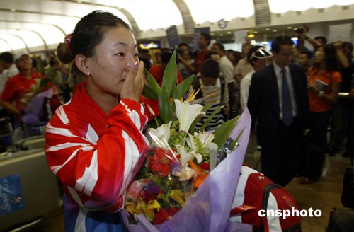 8月23日,參加雅典奧運會的中國射箭隊主力隊員何影回到北京,在首都國際機場受到人們的熱烈歡迎。中新社記者:盛佳鵬