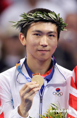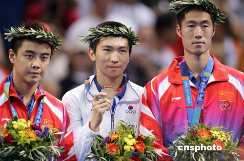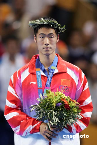 當(dāng)?shù)貢r間八月二十三日下午,韓國選手柳承敏在雅典奧運(yùn)乒乓球男子單打決賽中以四比二戰(zhàn)勝中國選手王皓獲得金牌。中新社記者:毛建軍