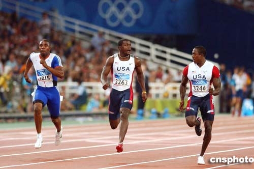 在當地時間22日進行的男子100米半決賽中,美國選手Justin Gatlin和Shawn Crawford一邊比賽,一邊交談。