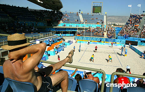 圖為一球迷在觀看沙灘排球比賽的畫面。