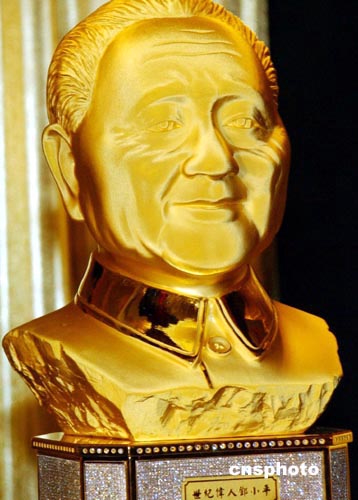 為紀念世紀偉人、中國改革開放的總設計師鄧小平先生百年誕辰,“金至尊”特別動員三十多人精心鑄造“鄧小平金至尊美鉆金像”,八月二十四日在香港舉行揭幕儀式,該像以2.8公斤黃金,5000顆總重量達100卡拉鉆石鑄造而成,總價值超過港幣一百萬。作者:錢興強