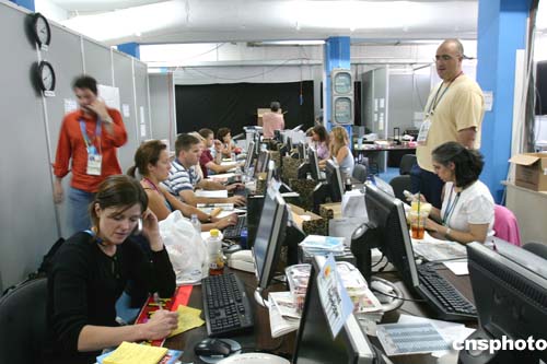 圖為NBC記者在雅典忙著轉播奧運會比賽的場景。