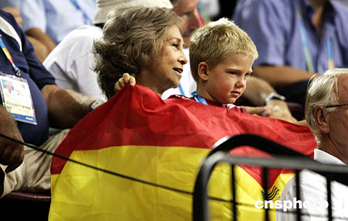 圖為西班牙皇后索菲亞與她的孫子在觀看西班牙隊和德國隊的手球比賽。