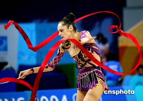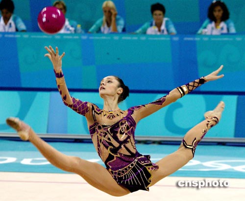 雅典當地時間八月二十五日,俄羅斯藝術體操個人全能選手KABAEVA進行奧運會賽前排練。中新社記者:王瑤