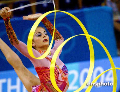 雅典當地時間八月二十五日,希臘藝術體操個人全能選手ANDRIOLA.E進行奧運會賽前排練。中新社記者:王瑤
