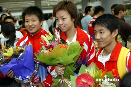 8月26日,北京首都國際機場又迎來一批載譽歸來的奧運健兒,包括羽毛球、乒乓球、游泳、體操、舉重等200多名選手,他們在機場受到英雄般的歡迎,幾乎每個人都被鮮花包圍。圖為滕海濱(右)、張怡寧(中)、王旭(左)三位雅典奧運會金牌獲得者在機場一起接受媒體采訪。中新社記者:盛佳鵬