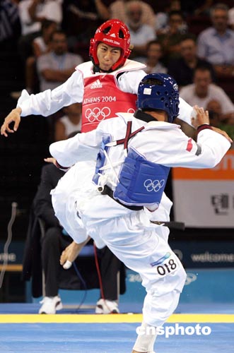 當地時間八月二十六日下午,在雅典奧運會男子五十八公斤級跆拳道比賽中,臺北選手朱木炎戰勝埃及選手殺入決賽。中新社記者:毛建軍