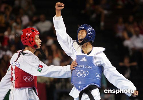 當(dāng)?shù)貢r(shí)間八月二十六日晚,在雅典奧運(yùn)會(huì)男子五十八公斤級(jí)跆拳道決賽中,中國(guó)臺(tái)北選手朱木炎戰(zhàn)勝墨西哥選手SALAZAR獲得金牌。中新社記者:毛建軍
