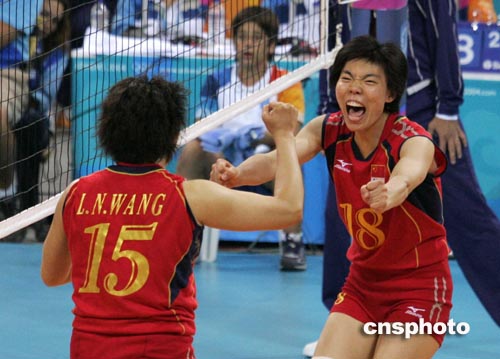 圖為中國隊副攻手張萍與隊友慶祝勝利。