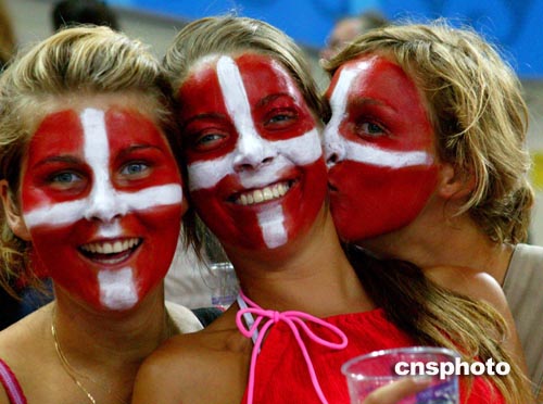 在當地時間8月26日晚舉行的奧運會女子手球四分之一決賽上,丹麥女球迷將國旗畫在臉上為本國選手助威。中新社記者:王瑤