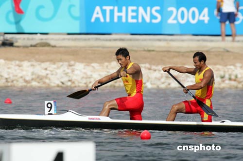 當(dāng)?shù)貢r(shí)間八月二十七日,在雅典奧運(yùn)會(huì)男子雙人劃艇一千米比賽中,中國(guó)選手孟關(guān)良、楊文軍獲得第九名。中新社記者:毛建軍