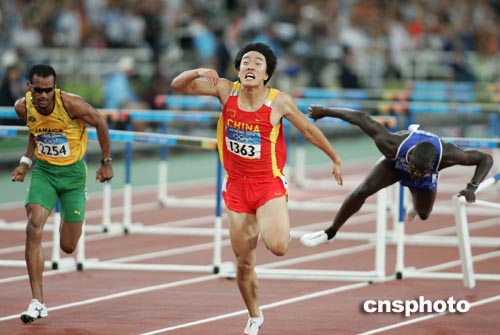 參加今晚奧運會男子一百一十米欄決賽的八名選手實力接近,美國運動員特拉梅爾由于過于緊張,首槍搶跑。重新回到起跑線上的八名選手再度出發,劉翔仿如離弦之箭沖出,搶得先機,并逐漸將優勢擴大。