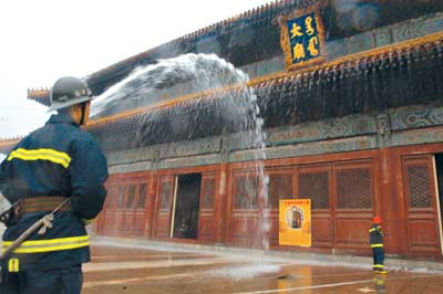 故宮消防中隊(duì)出動(dòng)兩名搶險(xiǎn)員,搶救被燒物資,同時(shí)府右街消防中隊(duì)派出兩副擔(dān)架,從殿內(nèi)“火海”中救出兩名“傷員”。花市消防中隊(duì)的數(shù)名消防員,在殿內(nèi)架起兩節(jié)梯,從內(nèi)部滅火。