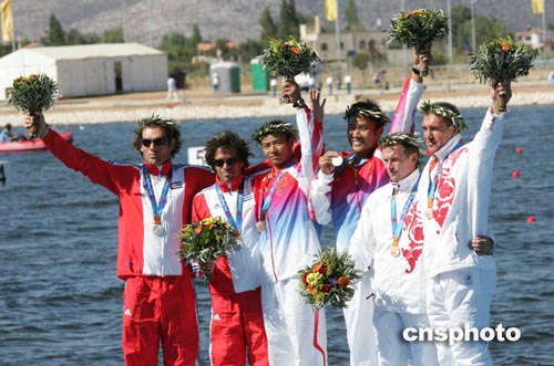 當地時間八月二十八日,中國選手孟關良、楊文軍在雅典奧運男子五百米雙人劃艇比賽中奪得金牌。中新社記者:毛建軍