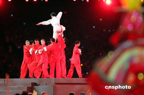 當地時間八月二十九日,第二十八屆奧林匹克運動會在雅典圓滿結束。圖為中國演員在閉幕式上表演節目。中新社記者:毛建軍