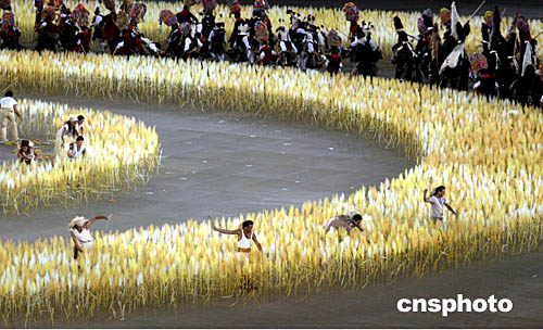 圖為在當?shù)貢r間8月29日舉行的雅典奧運會閉幕式中,表演者表演小麥豐收的鏡頭。