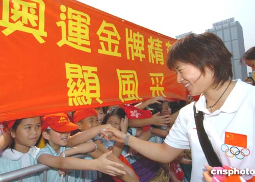 今天早上在香港灣仔金紫荊廣場(chǎng)的金紫荊雕像一樣是金光閃閃,一樣的燦爛奪目,不一樣的是今天這里迎來了一眾重量級(jí)的訪客參觀,他們身上散發(fā)的光芒四射與金紫荊一樣耀眼,他們便是中國(guó)奧運(yùn)金牌精英代表團(tuán),代表團(tuán)在廣場(chǎng)與市民握手、簽名,在場(chǎng)市民均雀躍不已并拿起照相機(jī)拍下這難忘的一刻。
