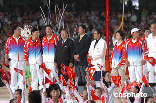 國家奧運金牌代表團繼續訪港第二日行程,7日晚上,五十名金牌運動員出席在香港大球場舉行的精英大匯演。圖為香港民政事務局長何志平(左四)出席大匯演。作者:洪少葵