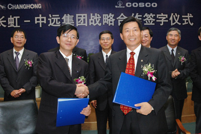 中新四川網9月8日消息(肖青)四川長虹集團公司董事長趙勇與中國遠洋運輸(集團)總公司總裁魏家福今日在綿陽分別代表長虹集團和中遠集團簽署了戰略合作協議書,雙方承諾將在國際運輸、物流、服務、信息方面展開更深更廣的合作,此舉標志著兩公司已經超越業務合作進入一個嶄新的階段。