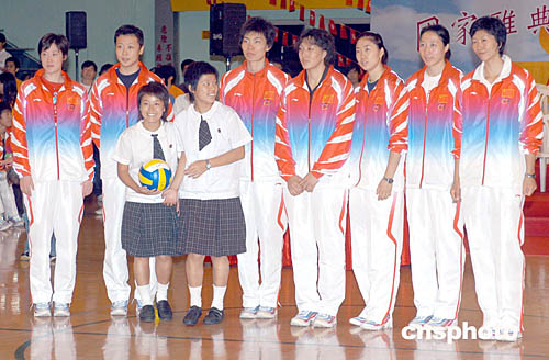 國家奧運金牌代表團9月8日在香港與中學生運動交流,并舉行抽獎活動,中國女排部份隊員向獲獎學生致送簽名排球及合照。作者:鄧慶樂