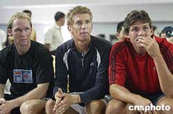 德國網球名將舒特勒(左一)、美國網球選手鄧特(左二)等在抽簽儀式上十分關注自己的對陣選手。中新社記者:盛佳鵬