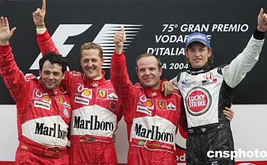 中新網9月13日電 在意大利蒙扎賽道,法拉利再次包攬F1大獎賽意大利站的前兩名,已經確保本賽季奪冠的舒馬赫甘居第二,配合巴里切羅登上了冠軍寶座。