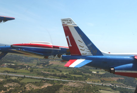 法國空軍的“法蘭西巡邏兵”飛行表演隊正式成立于1964年2月。飛行表演隊的飛機涂著同法國國旗一樣的紅、白、藍(lán)三種顏色,機群在空中做飛行表演時也常常把著三種顏色的煙跡留在空中。它象征著“自由”(紅色)、“民主”(白色)、“博愛”(藍(lán)色),體現(xiàn)了法國人民勇敢、浪漫的傳統(tǒng)和對未來美好的愿望。圖為飛行表演隊正在作精彩的飛行表演(來源:艦船知識網(wǎng)絡(luò)版)