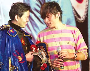 慶功會以京劇《大鬧天宮》開場,各路天王把周杰倫簇擁在中央,隱喻“唯周杰倫獨尊”。隨后,川劇大師彭登懷的弟子上臺伴著《我的地盤》表演了變臉。站在臺側的周杰倫目不轉睛地盯著表演者,然后走到表演者身邊左看右看,最后干脆動手搜起身來。聽到觀眾的笑聲,周杰倫很不好意思地說:“等回家再把老師扒光了查。”
