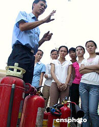 中國(guó)第一列跨海火車客運(yùn)列車即將開通,應(yīng)聘的列車乘務(wù)員們九月中旬接受海南海事局海船船員專業(yè)知識(shí)培訓(xùn),這是消防教員在講解滅火器的操作。據(jù)了解,這些乘務(wù)員將成為國(guó)內(nèi)第一批擁有海船船員資格證書,同時(shí)服務(wù)于陸地與跨海運(yùn)輸?shù)幕疖嚦藙?wù)員。作者:關(guān)向東