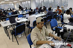 九月十四日,正在北京網(wǎng)球中心舉行的中國網(wǎng)球公開賽因雨推遲所有比賽,眾多中外記者在網(wǎng)球中心的新聞中心內等待比賽重開。中新社記者:盛佳鵬
