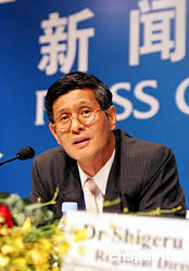 九月十四日,參加世界衛生組織西太區委員會第五十五屆會議的專家和代表在上海繼續討論。圖為世衛西太平洋辦事處主任尾聲茂晚間舉行記者會時表示,由于禽流感是農村疾病,比SARS更難控制,所以對禽流感要做好最壞的打算。作者:潘索菲