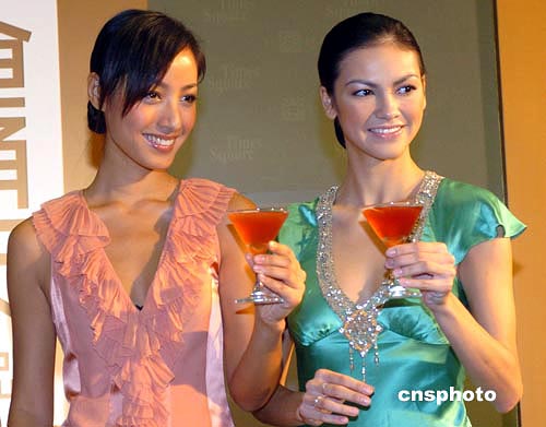 香港名模蔣怡(左)﹑Rosemary14日出席香港時(shí)代廣場(chǎng)“時(shí)代b2”開(kāi)業(yè)儀式。