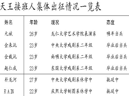正當宋承憲、張赫、韓在石“非法逃兵役”事件受到各界關注時,還沒當兵的天王接班人元斌、金來沅、金載沅、趙仁成、RAIN即將面臨同樣的問題,可以想像的是,他們會記取前車之鑒而不敢造次。韓國男星沒當兵的人實在太多,許多小天王為了自己大好演藝事業,不敢面對現實,一再以休學來拖延當兵,年紀都二十郎當了,還在念大一、大二,不然就像樸龍河一樣到了27歲還沒畢業去當兵。