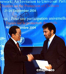 當地時間九月二十二日,中國常駐聯合國代表王光亞(左)在紐約聯合國總部向安南秘書長的代表交存了中國加入《聯合國人員和有關人員安全公約》的加入書。三十天后,該公約將對中國生效。作者:趙海燕