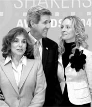 日前,她出席了紐約一個名為第七屆全年“RedbookMothersand-Shakers”大獎,接受大會頒贈的獎項。同一場合,與現任美國總統布什競逐下任美國總統的克里(圖中)也有出席,還與這位巨星一同合照。(鐵巖)