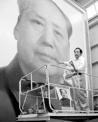 按照慣例,每年國慶節前,天安門城樓的毛澤東主席畫像都要更換,今年也不例外。自1977年就一直擔負畫主席像工作的畫家葛小光已在畫室半個多月,目前這幅長6米、寬5米的油畫已近尾聲。葛小光說,由于主席像掛在戶外,經受風吹日曬,所以這幅油畫的顏色和造型需要技巧,盡量減少季節、光照等因素的影響,掛上去后無論從哪個角度看都不會有太大變化。如果天氣沒有變化,27日晚將掛上城樓。
