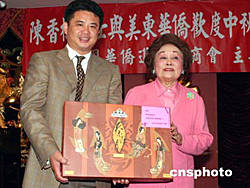 美東時間二十四日中午,著名美籍華人陳香梅從華盛頓趕到紐約,與美東華僑一起歡度中秋佳節(jié)。美國華商會會長鄧龍在聯(lián)誼會上向陳香梅(右)贈送精制的月餅。作者:龔文謨