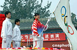 由北京市長從雅典奧運會帶回的奧運五環旗九月二十五日在第七屆北京國際旅游文化節開幕式上首次與北京市民見面,北京籍奧運冠軍羅微把奧運五環旗高高舉起走在盛裝行進表演隊伍的前面。此次旅游節將旅游與奧運主題相結合,力求打造北京奧運旅游品牌。作者:徐曦弋