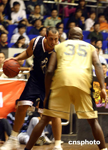 九月二十六日晚,美國(guó)前NBA明星隊(duì)二00四中國(guó)巡回賽演重慶站賽在重慶市體育館舉行,美國(guó)前NBA明星隊(duì)對(duì)陣美國(guó)大學(xué)生明星隊(duì)。經(jīng)過(guò)激烈角逐,美國(guó)大學(xué)生明星隊(duì)以一百零六比九十一勝出。作者:郭晉嘉