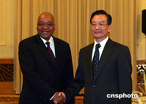 中新社北京九月二十八日電 中國全國人大常委會委員長吳邦國和國務院總理溫家寶今天分別在人民大會堂會見了南非副總統雅各布·祖馬。