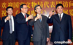 當地時間十月五日,中國駐紐約總領事劉碧偉(左二)、中國國家文物局局長單霽翔(右一)、紐約大都會博物館亞洲部主任屈志仁(右二)、副主任孫志新(左一)共同舉杯祝賀中國大型文物展“走向盛唐”在紐約大都會博物館開展成功。該展覽由中國國家文物局和紐約大都會博物館共同主辦,是迄今為止在美國舉行的最大的中國文物展,意在向美國人介紹中國“唐文化”的淵源。作者:趙海燕