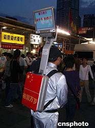時(shí)下,廣告幾乎在上海無孔不入。圖為國慶黃金周之夜,身背多媒體液晶顯示器的廣告人在上海徐家匯人群密集地帶串街走巷。作者:潘索菲