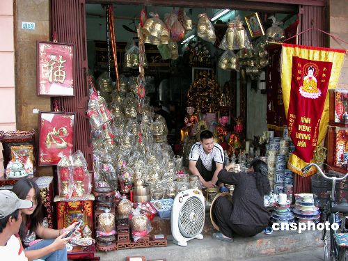 在越南河內街頭,隨處可見出售中國商品的小店。一些做工精細的佛像、陶瓷等中國小商品在河內深受歡迎。吳慶才 攝